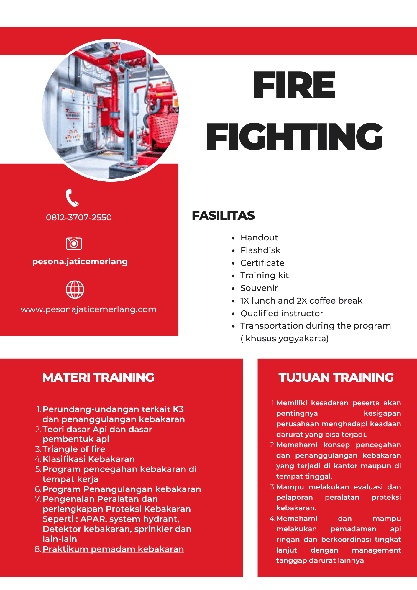 DESKRIPSI Kebakaran merupakan salah satu jenis keadaan darurat yang paling berbahaya dan dapat terjadi kapan saja, baik di lingkungan kerja maupun tempat …