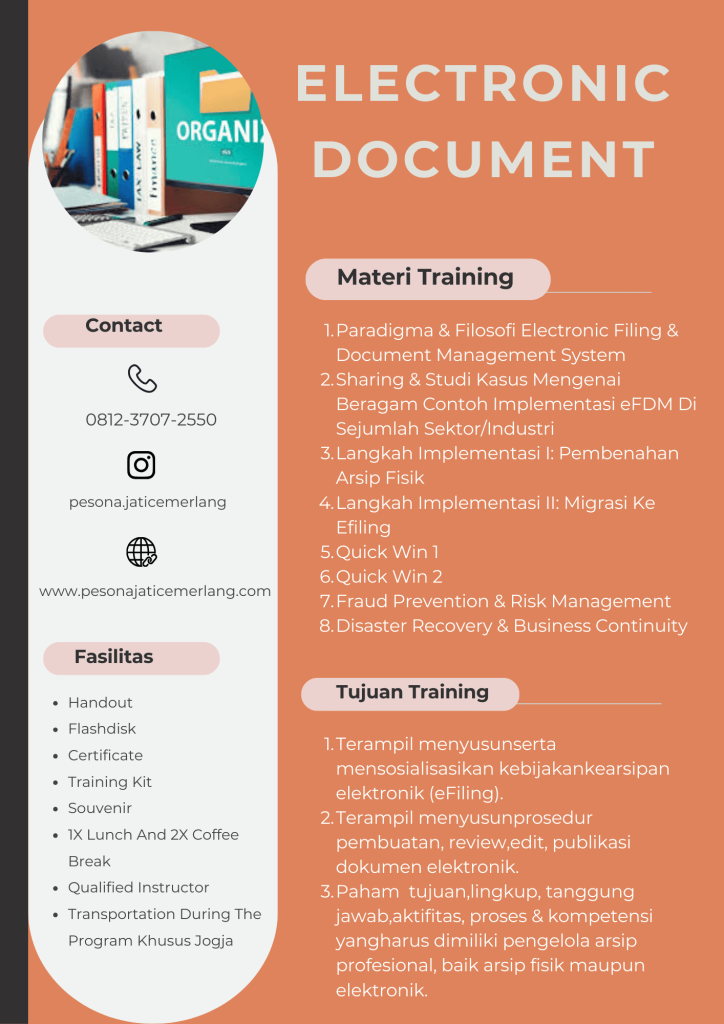 DISKRIPSI Seiring dengan perkembangan teknologi dewasa ini, banyak pihak yang menggunakan media elektronik dalam pengarsipan dan pengelolaan dokumennya. Sistem pengarsipan elektronik ini biasa dikenal dengan istilah Electronic Filing System (EFS). Penggunaan sistem kearsipan elektronik (Electronic Filing System) sangat membantu pihak pengelola arsip untuk dapat mengelola dokumen dengan baik secara efektif dan efisien, baik dalam hal penyimpanan, pengolahan, pendistribusian, …