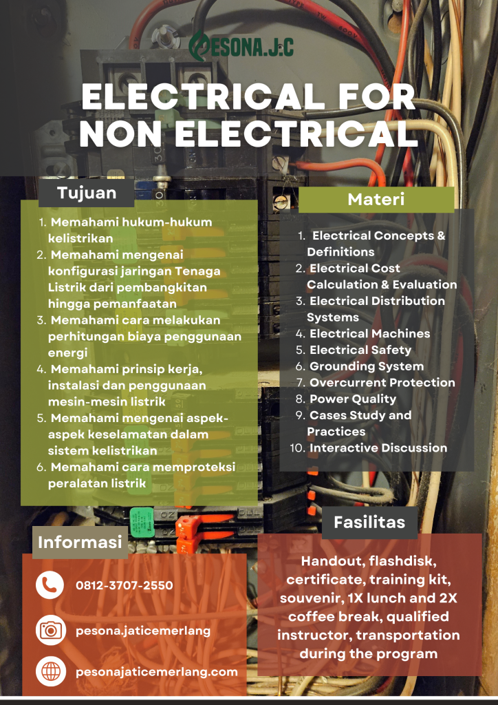 DESKRIPSI Training Listrik untuk Non Teknisi Listrik bertujuan untuk membekali peserta dengan pengetahuan kelistrika. Training ini mencakup peningkatan keterampilan interaktif dan langsung akan memberi peserta wawasan tentang cara mengurangi waktu henti peralatan, meningkatkan efisiensi dan keamanan secara keseluruhan, dan dapat menyelesaikan masalah yang mungkin belum dapat diselesaikan sendiri oleh peserta. TUJUAN TRAINING MATERI TRAINING METODE …